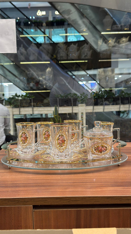 سرویس چایخوری لب طلا شامل یک عدد سینی طرح رز و ۶ عدد فنجان لب طلا طرح رز و یک عدد قندان لب طلا طرح رز وارداتی با ضمانت